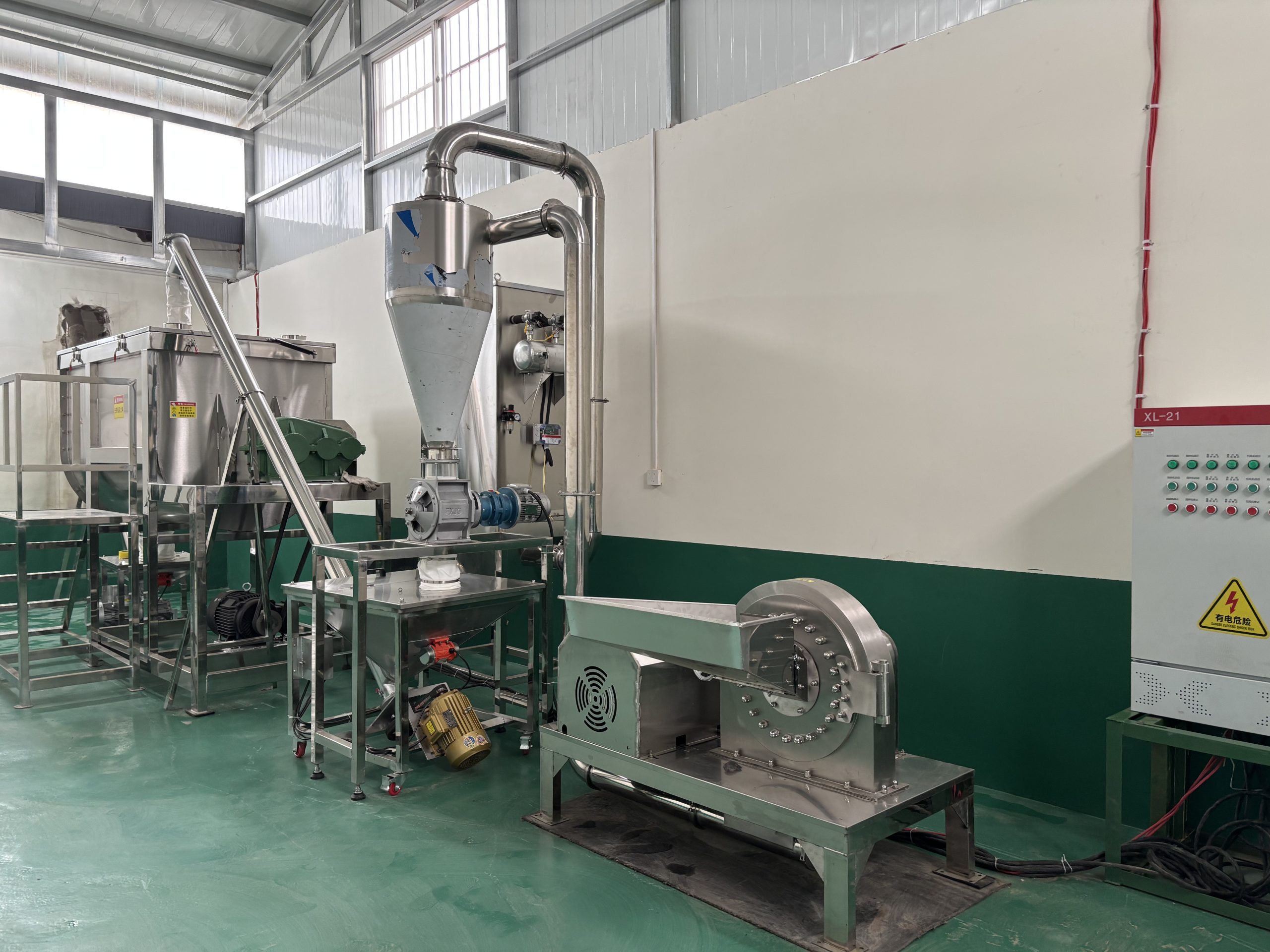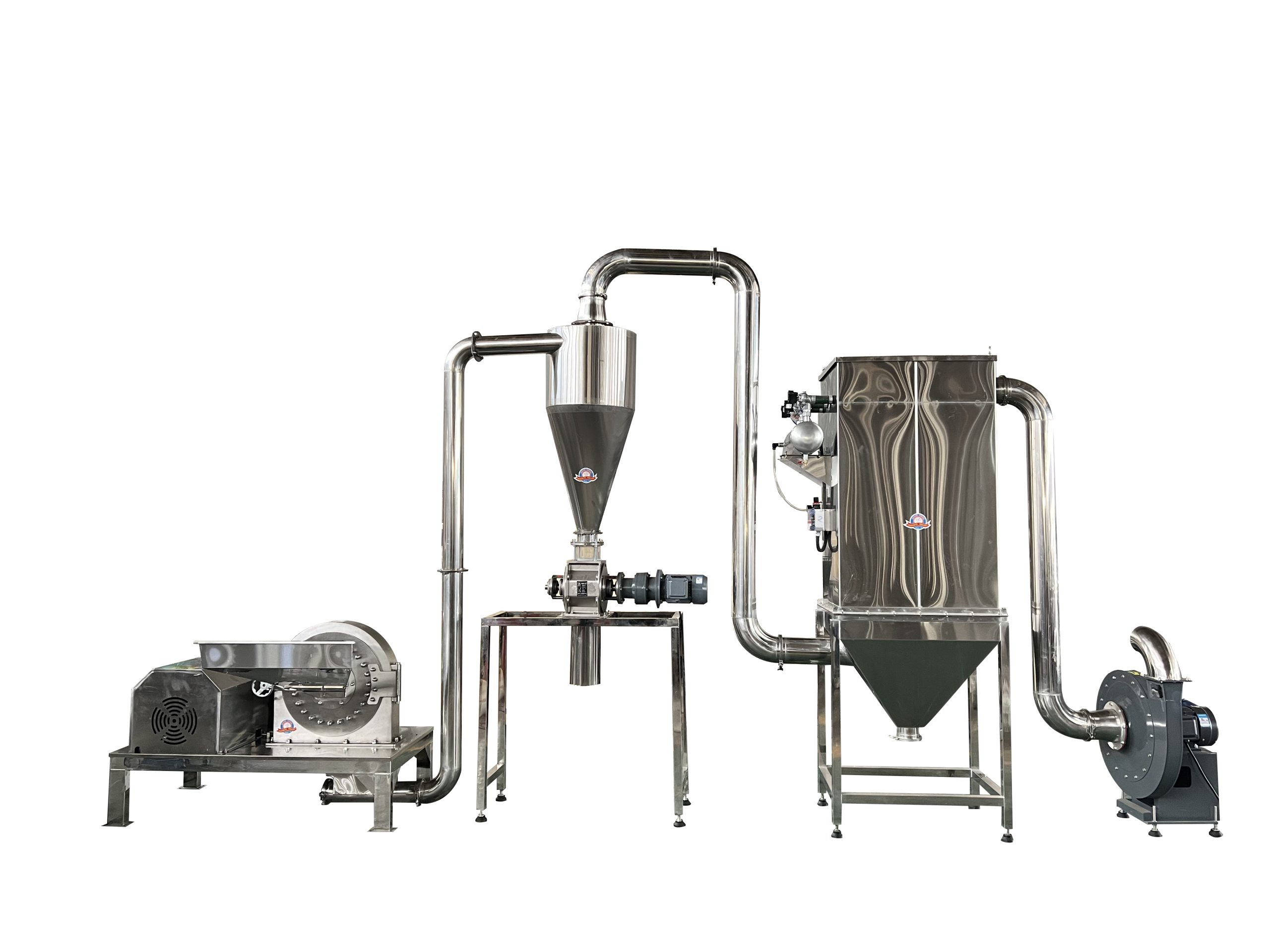 Optional add-ons: feed hoppers with controlled feeders, vibratory sieves after grinding, sample ports, and full stainless ducting for food/pharma applications.